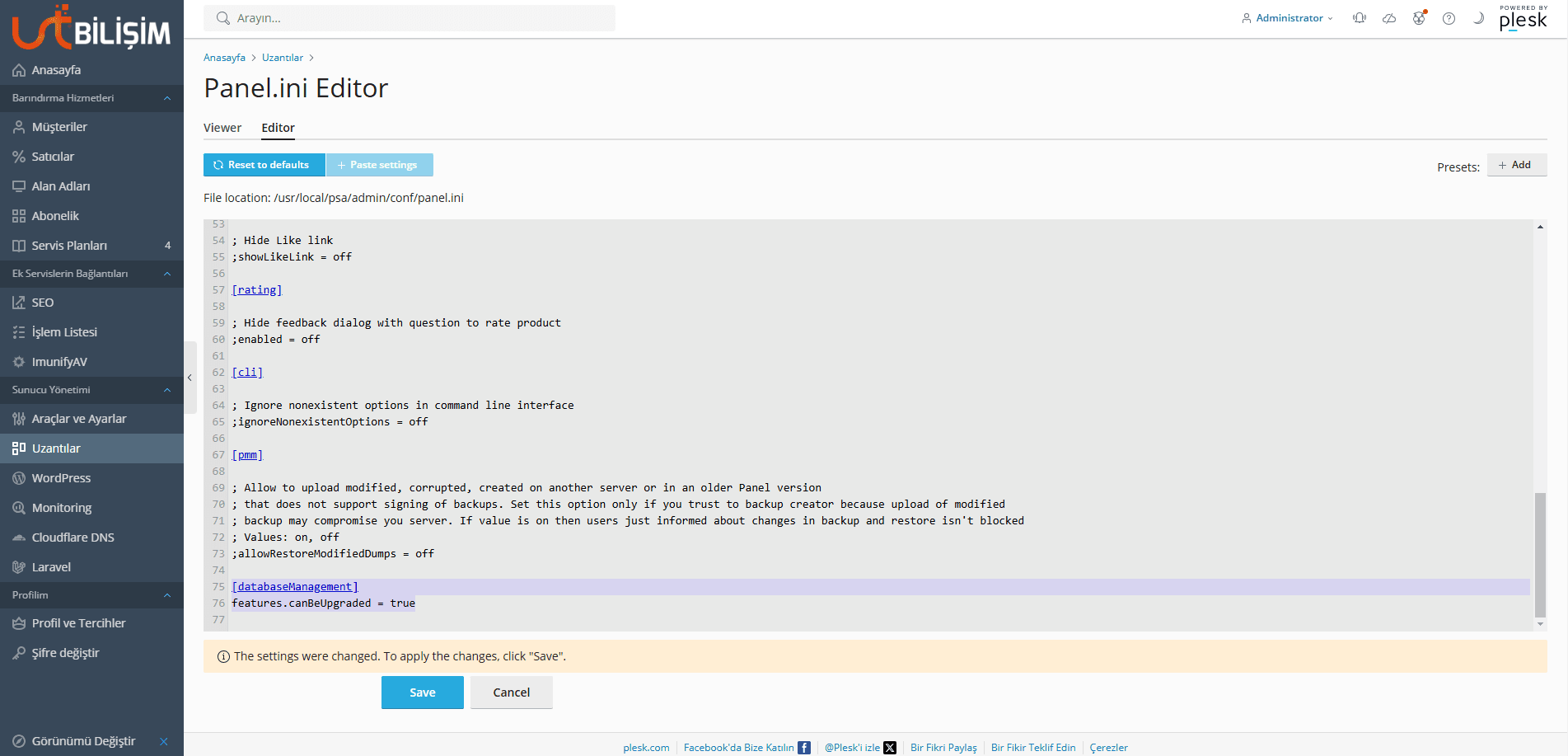 Plesk panele giriş yapıyoruz. Uzantılar alanında Panel.ini Editor şeklinde arama yapıyoruz ilgili eklentiyi yüklüyoruz.