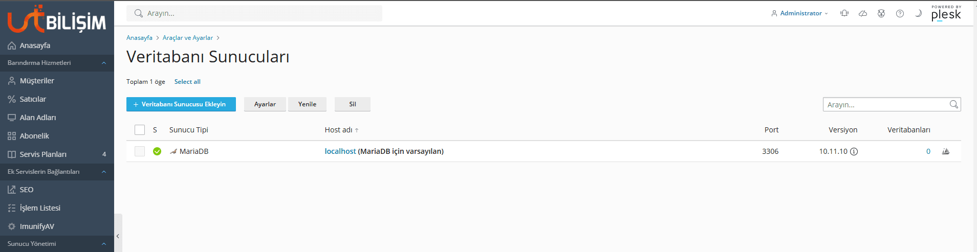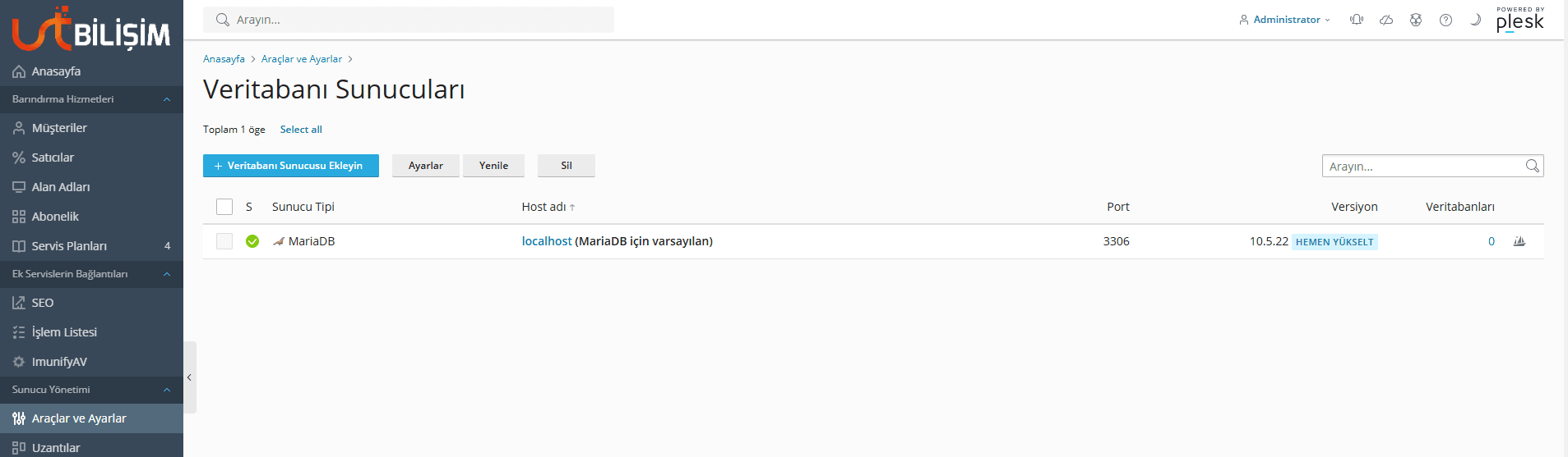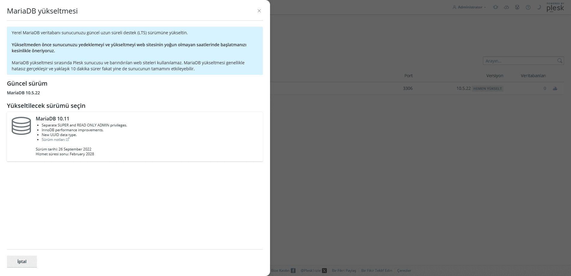 Yükseltme işlemi tamamlandığında bir hata almazsanız veritabanı sunucuları kısmında MariaDB sürümünüz en güncel haliyle görünecektir.