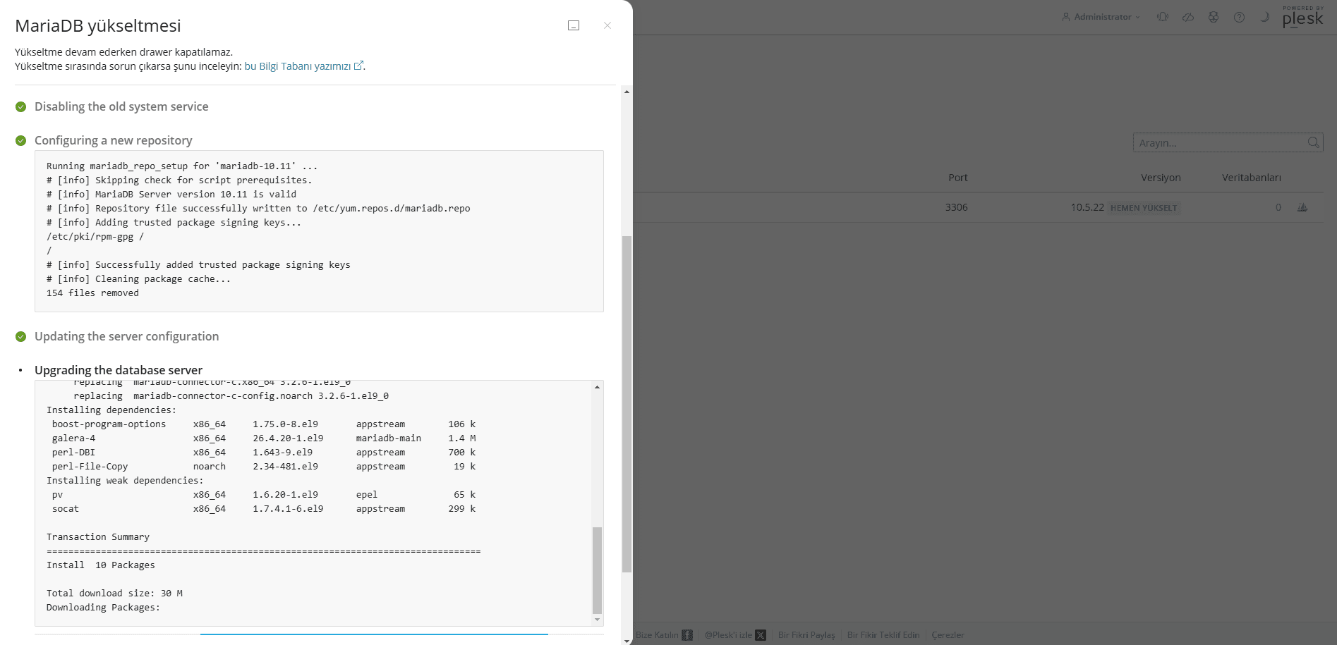 Yapmış olduğumuz düzenlemelerle MariaDB yükseltme işlemi için bildirim vermiş oldu.